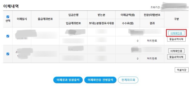 (4) 조회버튼을 누르면 하단에 이체내역이 나타나며 여기서 "이체확인증"을 누르면 인쇄화면으로 연결된다.