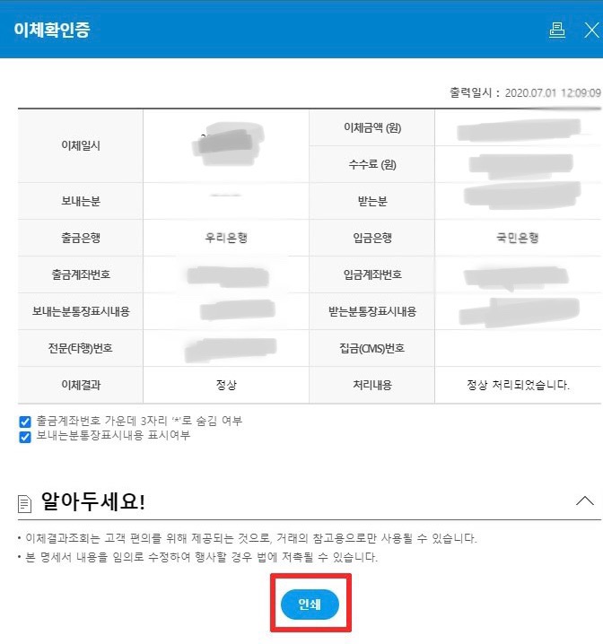 ## 이체확인증 서식은 아래와 같다. 최하단의 인쇄 버튼을 눌러주면 된다.