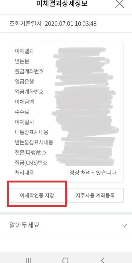 (5) 이체결과 상세정보가 뜨는데 처리내용 정상 처리 여부를 확인 후 이체확인증 저장을 누르면 휴대폰에 해당 내용이 저장된다.