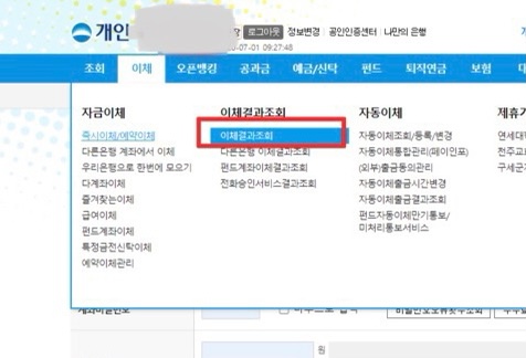 (2) 상단 메뉴중에 "이체"를 선택하 후 이체관련된 세부항목 중에 아래와 같이 "이체결과조회" 를 선택한다.
