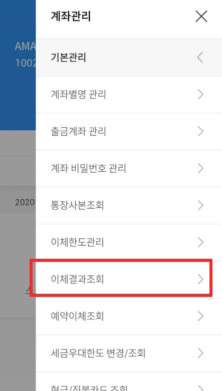 (3) 해당 계좌에 관련된 여러 메뉴가 나타나는데 "이체결과조회"를 선택한다.
