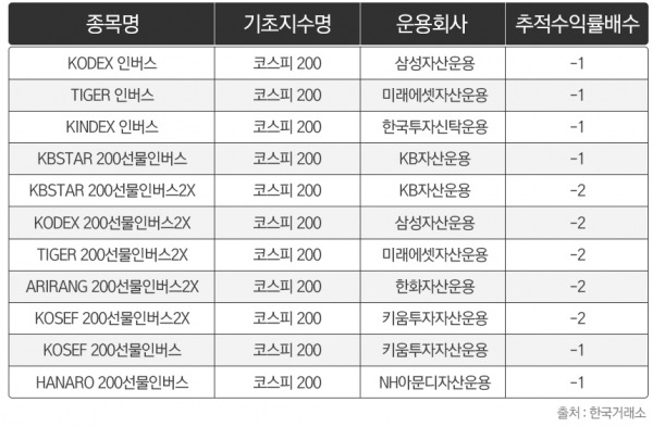 참고로 현재 코스피200기반 인버스 상품은 아래와 같다.